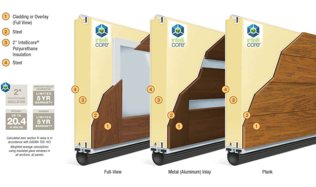 Full View design: Faux-wood doors with intellicore® polyurethane insulation. 6.3 R-value.